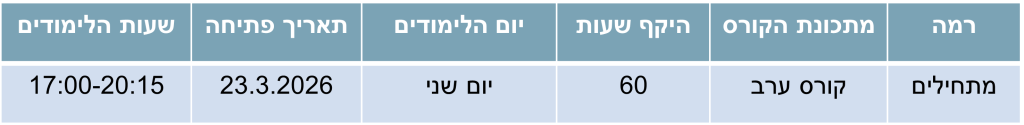 הקורס מכשיר את הלומדים לניהול שיחה ותקשורת, להתמצאות בשפה ולהעשרת אוצר המילים.