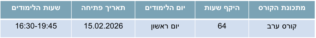 • הכשרה מקצועית ממוקדת בשנה אחת בלבד – מתכונת לימודים נוחה ומיטבית, מפגש אחד בשבוע בשעות אחר הצהריים.